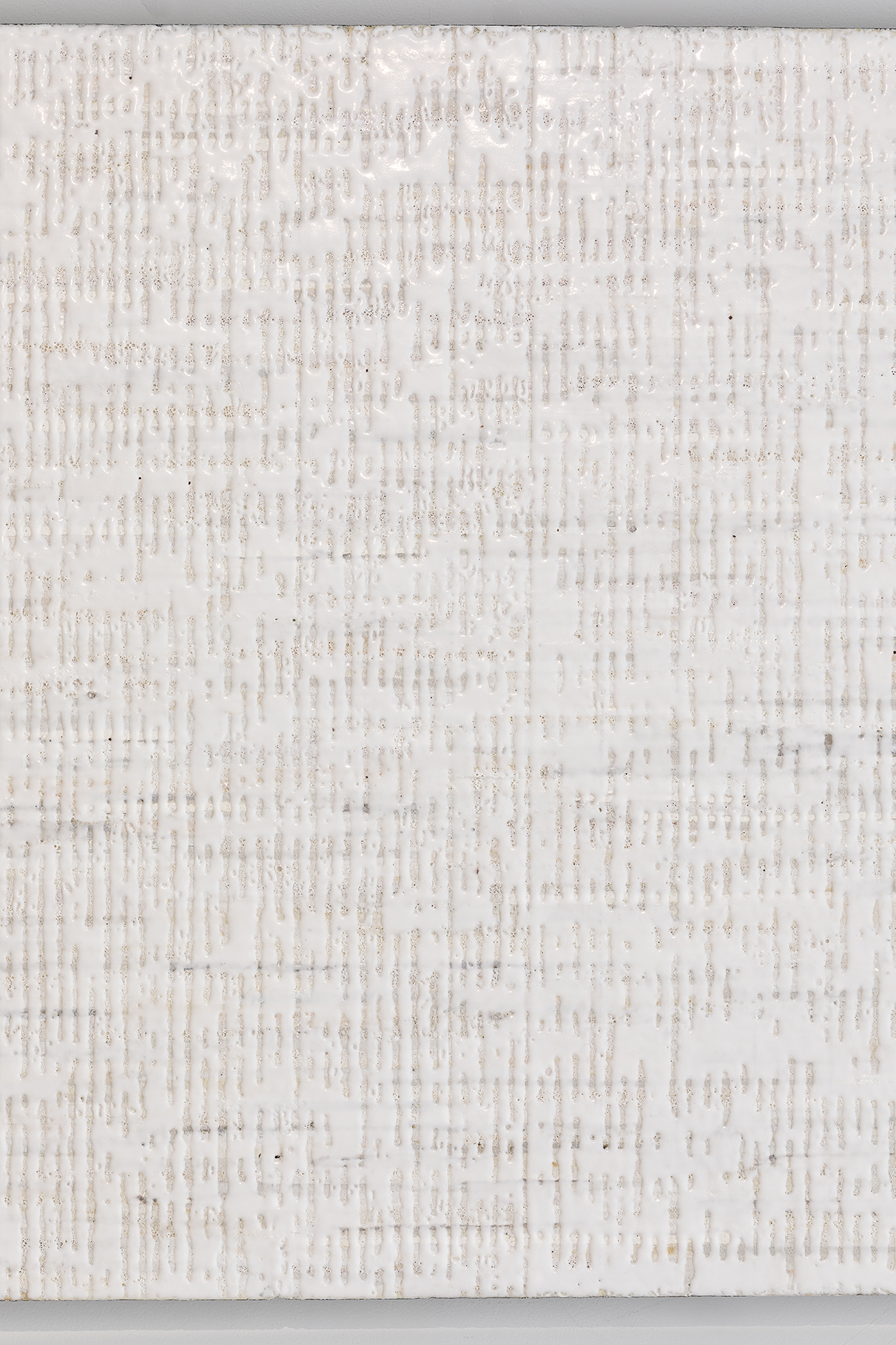 가로로는 미세하게 다른 유약들이 겹겹이 쌓이며 경계 없이 흐르고, 세로로는 단일한 유약이 곧게